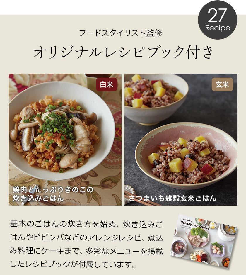 レコルト ヘルシー ライスクッカー 炊飯器 糖質カット 一人暮らし 3合炊き 白米3.5合 0.5合から炊ける コンパクト 調理家電 煮物 蒸し料理 電気ジャー レシピブック付き 直送品