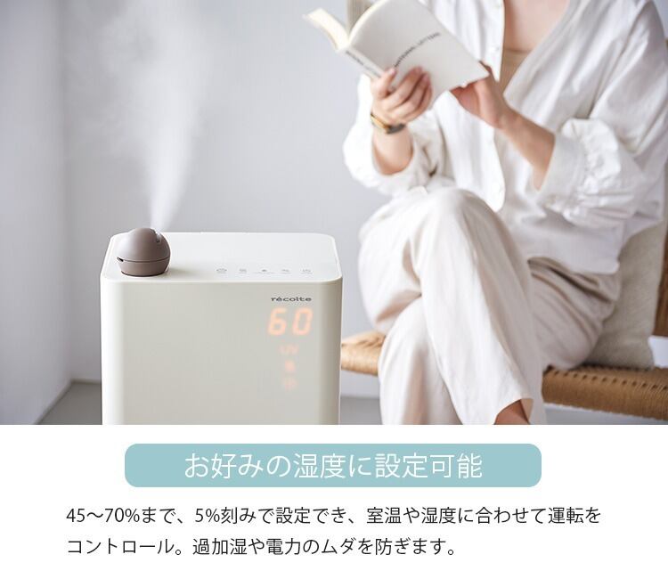 ミスト量は4パターンから設定可能。 45~70%までお好みの湿度に設定できて過加湿や電力のムダを防ぎます。